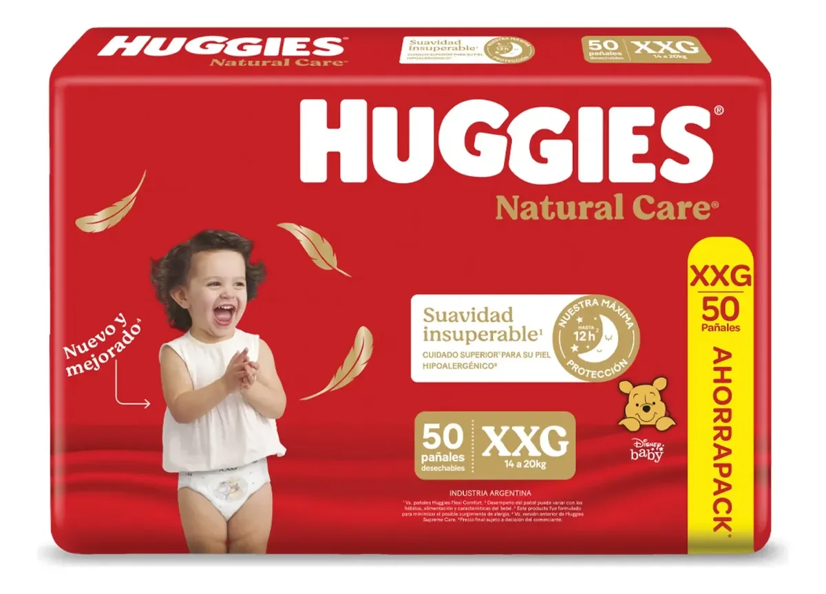 Los Pañales Huggies Natural Care XXG 50 Unidades ofrecen una absorción natural con fibras puras que cuidan la piel de tu bebé brindándole una suavidad reconfortante.
